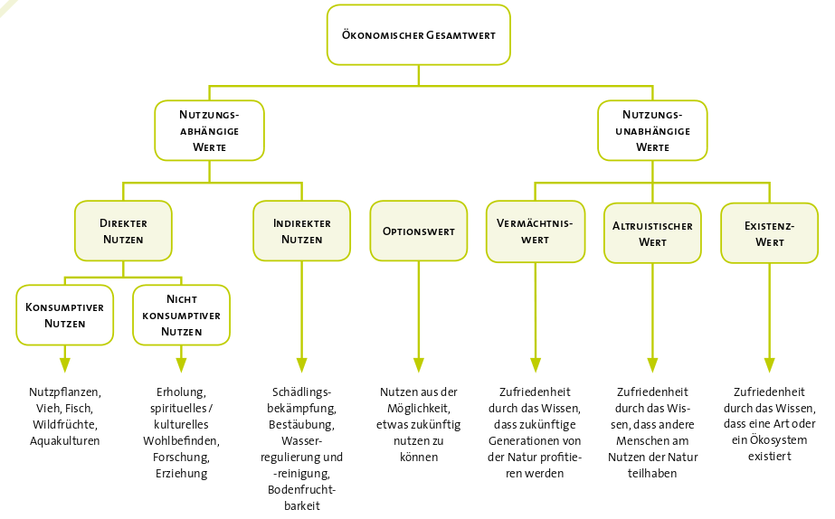 Wie lässt sich all das nun auf die umweltökonomische Bewertung übertragen? Wie eingangs erwähnt, wird zur Bewertung von Umweltgütern meistens das Konzept des ökonomischen Gesamtwertes (TEV) herangezogen (siehe Grafik).