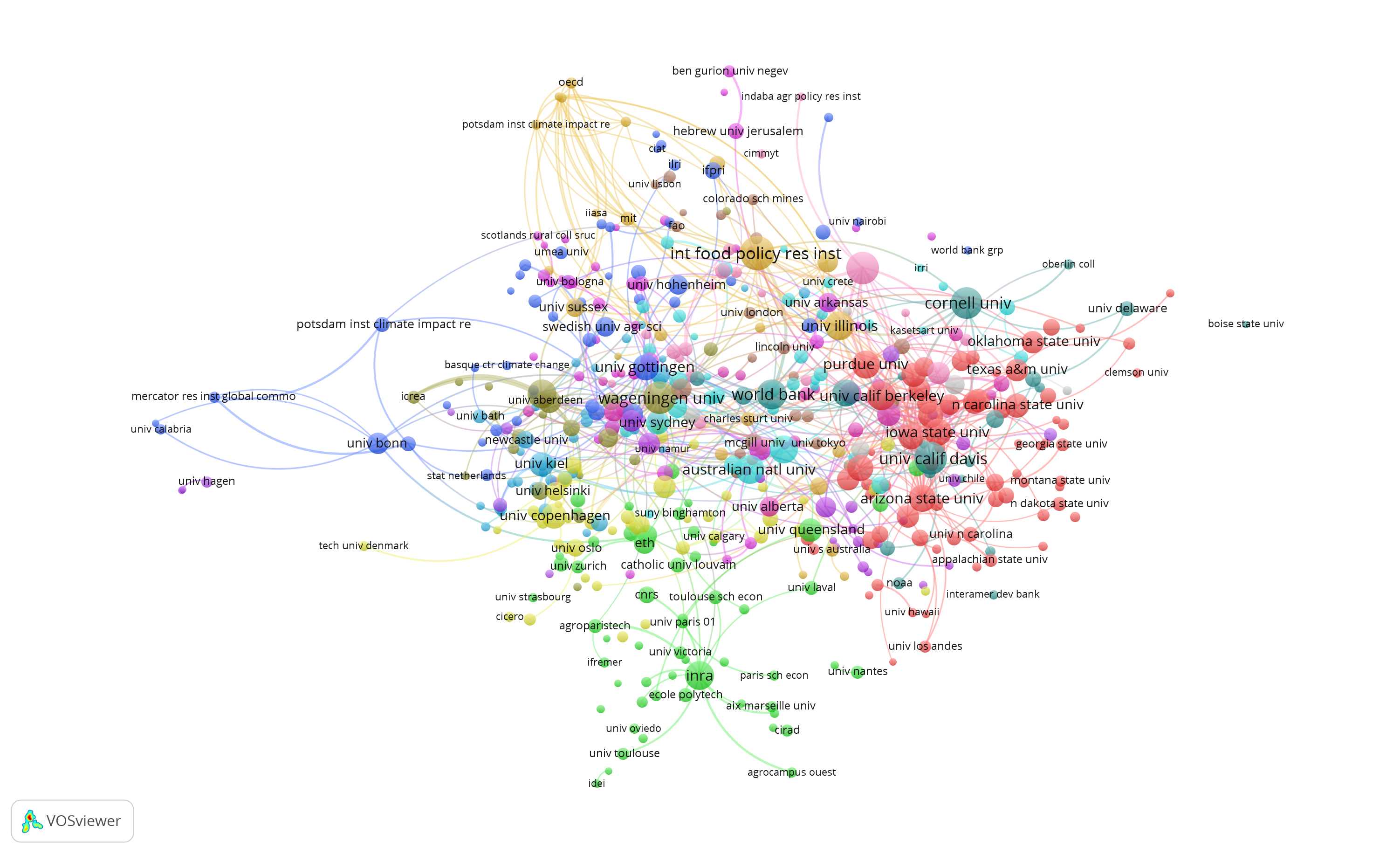 Das zweite Bild [volle Auflösung] zeigt die Ko-Autorschaften nach Institutionen. Da ich hier selbst keinen allzu guten Überblick habe (zumal viele der Institutionen US-amerikanisch sind, wie auch die Zeitschriften teilweise: Land Economics, JEEM, American Journal of Agricultural Economics sind sehr US-amerikanisch geprägt), überlasse ich die Interpretation dir, liebe Leserin.