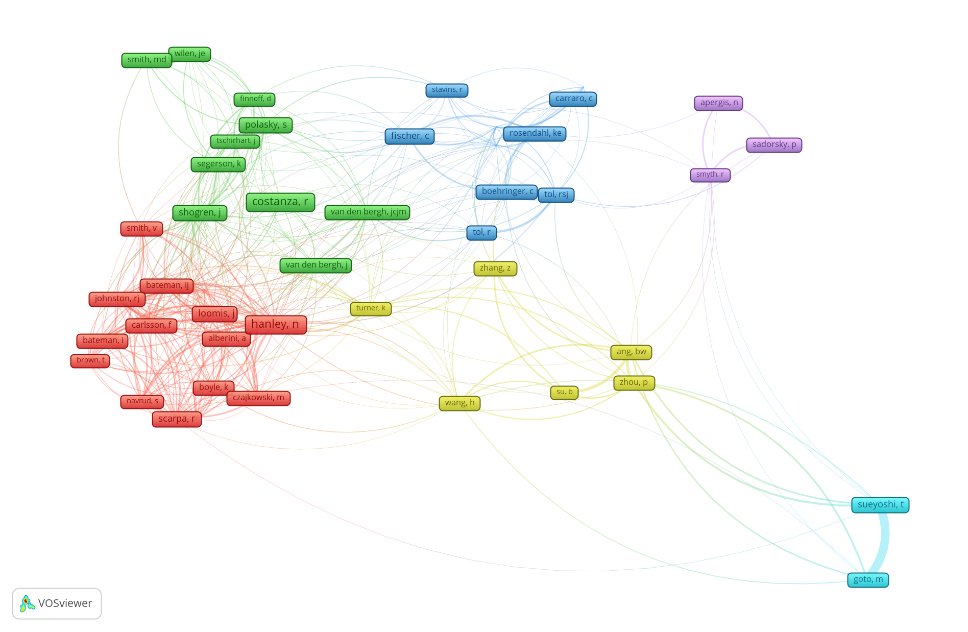 Das Ungleichgewicht spiegelt sich auch in der Betrachtung von Einfluss und einflussreichen Personen/Publikationen innerhalb der Disziplin. In einem Paper, an dem zwei Kollegen2 und ich derzeit arbeiten, in dem es um die Trends in umwelt- und agrarökonomischer Forschung gehen soll, haben wir eine Grafik mit den einflussreichsten3 Autor*innen in beiden Feldern. Trotz aller Ungenauigkeiten, die mit den zugrundeliegenden Daten zusammenhängen, ist es sehr auffällig, dass darunter keine Frauen zu finden sind. Hier ist eine aus denselben Daten generierte Grafik, in der die 50 meistzitierten Umweltökonom*innen in einem Zitationsnetzwerk abgebildet sind (erstellt wurde die Grafik im VOSviewer):