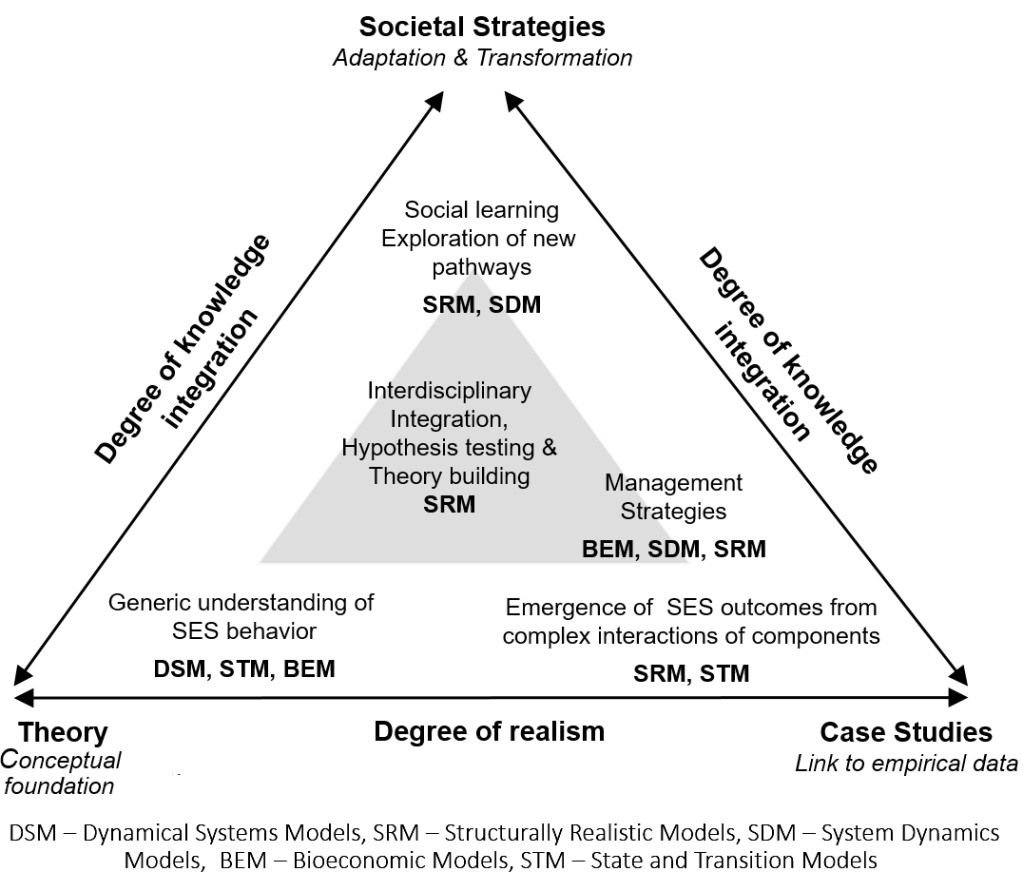 Einige Vorbemerkungen vorweg: auch wenn ich mit Modellierung angefangen habe, bin ich mitnichten ein „Modellierer“ – dafür bin ich noch viel zu „grün“ in dieser Materie. Außerdem sind und bleiben Modelle für mich ein Mittel zum Zweck im Rahmen meiner Forschung – nicht ihr Kern. Der Kern bleibt das Verständnis des Verhaltens von sozial–ökologischen Systemen, insbesondere hinsichtlich der Wirkung von Politikinstrumenten auf diese miteinander gekoppelten menschlichen und „natürlichen“ Systeme. Verschiedene Methoden kommen dabei grundsätzlich in Frage – Modellierung, in meinem Fall speziell agentenbasierte Modellierung, ist eine von ihnen, aber auch statistische/ökonometrische Analysen oder qualitative Sozialforschung können in diesem Kontext eine wichtige Rolle spielen. Aufgrund des eigenen Hintergrunds und Fokus beziehe ich mich im Folgenden primär auf sozial–ökologische Modelle, die in der einen oder anderen Form menschliches Verhalten abbilden (dass auch andere Modellierungsansätze denkbar sind, und für welche Zwecke was sinnvoll sein kann, zeigt die Grafik, die ich Schlüter et al (2019) entnommen habe; in deren Nomenklatur sind bioeconomic models (BEM) die Gruppe, die für mich vordergründig relevant ist).