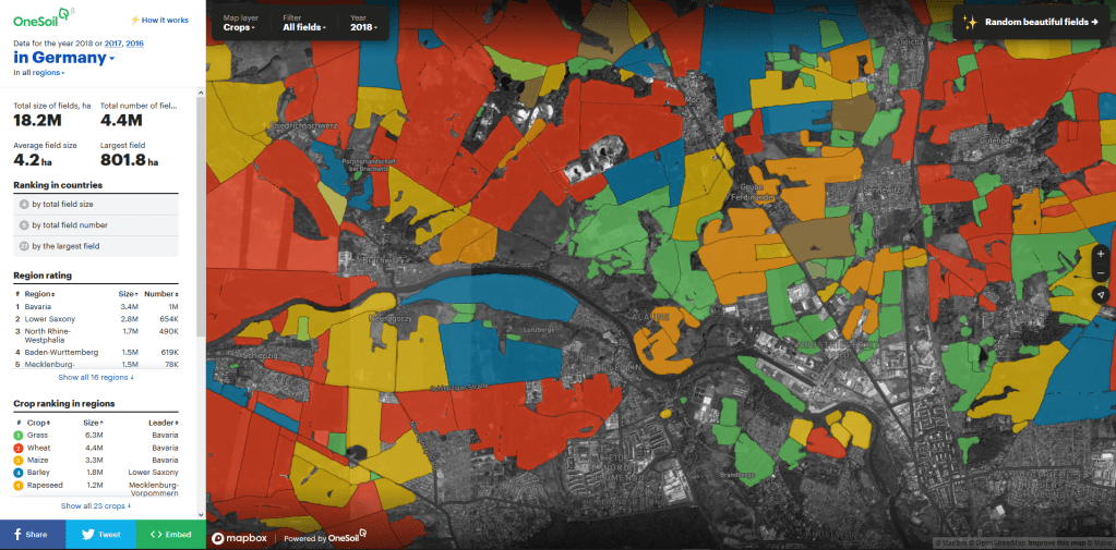 Die bisher diskutierten Grenzen von Modellierungsansätzen betreffen vor allem die Formulierung von Modellen, die Verknüpfung der einzelnen Entitäten, die Ziehung von Systemgrenzen und den Umgang mit Unsicherheit. Doch eine weitere große Herausforderung selbst für korrekt spezifizierte sozial–ökologische Modelle sind Daten. Es gibt zwar sogenannte konzeptionelle Modelle, die mit stilisierten, hypothetischen „Welten“ arbeiten, um Grundprinzipien des Verhaltens von Systemen zu identifizieren – ein schönes Beispiel sind viele Arbeiten meiner Kollegen Martin Drechsler und Frank Wätzold, beispielsweise Martins Modell zum Vergleich ergebnis- und handlungsorientierter Agrarumweltprogramme (zu diesem Thema s. auch hier). Die meisten Modelle bilden jedoch zumindest teilweise eine konkrete Region der Welt ab. Manche tun dies in stärkerem Maße, manche behalten konzeptionelle Elemente; doch die meisten Modelle sind zumindest teilweise empirisch und damit auf Daten angewiesen. Diese sind notwendig, um das spezifizierte Modell zu parametrisieren (einzelne Parameter mit konkreten Zahlenwerten zu versehen) und die Performanz des Modells zu testen (z. B. durch „Nachmodellierung“ der Vergangenheit). An viele Daten kommt man jedoch nicht so leicht heran. Ein für meine Arbeit besonders relevantes Beispiel sind Daten über landwirtschaftliche Betriebe: welche Felder gehören wem (welche Felder es überhaupt wo gibt, lässt sich inzwischen glücklicherweise mithilfe von Satellitendaten ganz gut ermitteln; s. Bild); welche Managementmaßnahmen (Düngung, Unkrautbekämpfung etc.) werden wo, wie und wann angewendet etc.