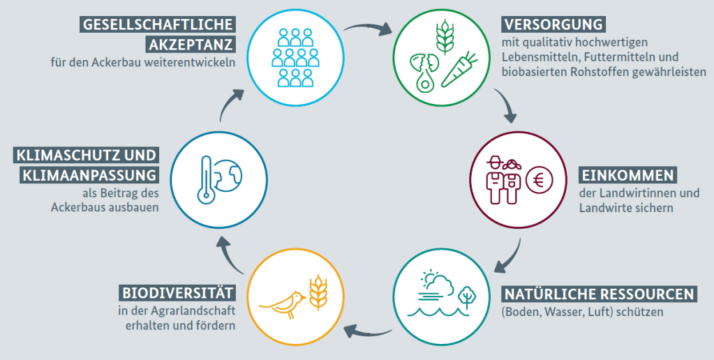 Zunächst: die Ackerbaustrategie 2035 des BMEL sollte nicht mit der ein Jahr älteren Ackerbaustrategie der deutschen Landwirtschaft des Deutschen Bauernverbandes (DBV) verwechselt werden. Gleichwohl gibt es signifikante inhaltliche Überschneidungen zwischen den beiden Papieren – auch wenn die Schwerpunkte etwas unterschiedlich liegen und die BMEL-Strategie in vielen Punkten umfassender ist. Sie besteht aus zwei Teilen: den Leitlinien sowie den Handlungsfeldern. Leitlinien wurden für die folgenden Bereiche formuliert: Versorgung, Einkommenssicherung, Umwelt- und Ressourcenschutz, Biodiversität, Klimaschutz und Klimaanpassung sowie Gesellschaftliche Akzeptanz (s. Abbildung weiter unten). Die Handlungsfelder werden nochmal unterteilt in Fachliche und produktionsbezogene Handlungsfelder (Boden, Kulturpflanzenvielfalt und Fruchtfolge, Düngung, Pflanzenschutz, Pflanzenzüchtung, Digitalisierung, Biodiversität, Klimaanpassung) sowie Übergreifende Handlungsfelder (Klimaschutz, Bildung und Beratung, Landwirtschaft und Gesellschaft, Begleitung der Umsetzung). Der Kern des Diskussionspapiers ist die Betrachtung der einzelnen Handlungsfelder vor dem Hintergrund der Leitlinien. Dabei wird die Diskussion eines jeden Handlungsfeldes in Ausgangslage, Problemstellung, Zielkonflikte, Ziele, Indikatoren, Maßnahmen und Wirtschaftlichkeitsbewertung unterteilt. Am Ende des Dokuments findet man darüber hinaus eine Bewertungsmatrix, mit der alle vorgeschlagenen Maßnahmen qualitativ im Hinblick auf ihre Wirkung auf die Ziele der Ackerbaustrategie (Versorgung, Schutz natürlicher Ressourcen, Förderung der Biodiversität, Klimaanpassung, Klimaschutz, Gesellschaftliche Akzeptanz) bewertet sowie mit einer groben Einschätzung des erwarteten Umsetzungszeitrahmens (kurz, mittel, lang) versehen werden.