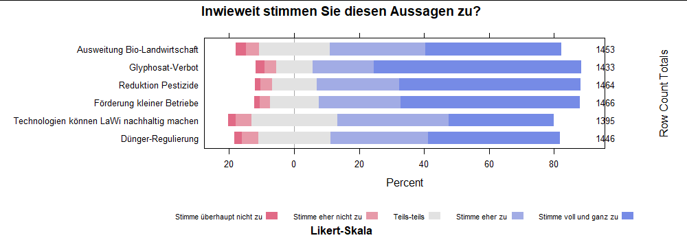 Dabei ging es darum, am Anfang des Fragebogens vorzufühlen, wie verschiedene Debatten wahrgenommen/bewertet werden. Daher sind die abgefragten Aussagen bis auf die vorletzte (zu modernen Technologien) eher der landwirtschaftskritischen Seite der Debatte entnommen.