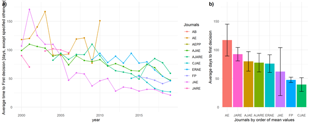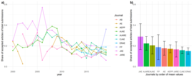 Wir stellten fest, dass die Annahmequoten (also der Anteil angenommener an allen eingereichten Manuskripten) bei allen Zeitschriften im Laufe der Zeit gesunken sind. So sank beispielsweise die Annahmequote beim American Journal of Agricultural Economics von ca. 25 % in den frühen 2000er Jahren auf 11 % im Jahr 2019. Die Unterschiede zwischen den einzelnen Zeitschriften sind jedoch beträchtlich (Abbildung 1, Feld b). Geringere Annahmequoten können auch teilweise das Ergebnis einer erheblichen Zunahme von Einreichungen im Laufe der Zeit sein. So wurde in Agricultural Economics im Jahr 2000 für 49 Manuskripte eine Entscheidung getroffen; im Jahr 2019 waren es bereits 812.