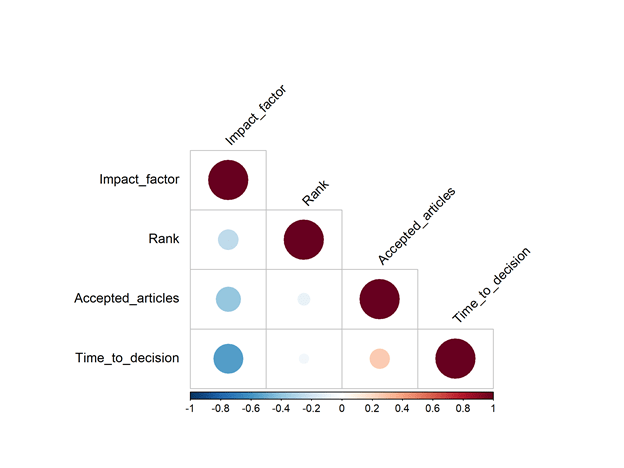 Wir stellen fest, dass es über alle Zeitschriften hinweg Zielkonflikte zwischen den verschiedenen Indikatoren gibt. So geht beispielsweise ein hoher Anteil angenommener Artikel mit einer längeren Zeit bis zur ersten Antwort einher, während ein hoher Impact Factor mit einem geringeren Anteil angenommener Artikel (Korrelation: -0,34), aber auch mit einer längeren Zeit bis zur Entscheidung (-0,53) verbunden ist. Es gibt also keine eindeutigen sweet spots für Autor:innen, denn schnellere Entscheidungen können durchaus geringere Erfolgschancen bedeuten.