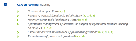 Doch zurück zum GAP-Strategieplan. Den wichtigsten agrarumweltpolitischen Hebel bilden, wie bereits oben ausgeführt, die freiwilligen Maßnahmen im Rahmen der AUKM sowie die neuen Ökoregelungen. Bei den Ökoregelungen liegt der Schwerpunkt explizit auf Biodiversitäts- und Klimaschutz. Von den zahlreichen durch die Europäische Kommission vorgeschlagenen Maßnahmen (darunter mehrere stark bodenrelevante Carbon-Farming-Maßnahmen; s. Abbildung unten sowie hier) wurden sieben ausgewählt, von denen keine einen direkten Bodenschutzfokus aufweist, auch wenn insbesondere lange Fruchtfolgen, Agroforst sowie Grünlandextensivierung (zwei Ökoregelungen) positive Auswirkungen auf den Boden haben dürften. Ähnlich sieht es bei den AUKM aus, innerhalb derer ein „Bodenschutz-Block“ vorgesehen ist mit Maßnahmen wie Erosionsschutzflächen, konservierende Bodenbearbeitung oder Leguminosenanbau. Auch in den Maßnahmenblöcken „Klimaschutz“ (Moorböden), „Wasserqualität“ und „Ökologischer Landbau“ finden sich bodenfördernde Maßnahmen. Allerdings werden nicht alle Maßnahmen in jedem Bundesland angeboten – gerade im Bereich Bodenschutz gibt es diesbezüglich einige Lücken. Zudem handelt es sich hierbei um freiwillige Instrumente, die dadurch alles andere als flächendeckend umgesetzt werden. Dies liegt nicht zuletzt daran, dass die Zahlungshöhe oft nicht ausreichend ist, um die Teilnahme an AUKM (und analog wohl Ökoregelungen) attraktiv zu machen.