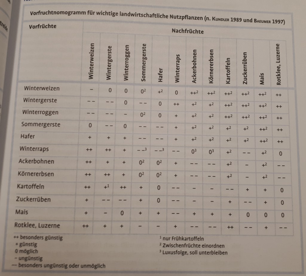 Fruchtfolgen sind aus gleich mehreren Gründen wichtig. Rein agronomisch betrachtet beugt eine gut gestaltete, an die Standortbedingungen angepasste Fruchtfolge Nährstoffungleichgewichten vor. Baut man im Extremfall Jahr für Jahr immer nur dieselbe Frucht an (die korrekte Definition von Monokultur), werden dem Boden immer die gleichen Nährstoffe entzogen – er wird ausgelaugt. Auch kann die Fruchtfolgengestaltung das Risiko von Krankheiten reduzieren, denn Pathogene fühlen sich besonders wohl, wenn immer die gleichen Pflanzen in sogenannter Selbstfolge auf dem Acker sind. Das geht bei manchen Pflanzen (z. B. Mais) noch ganz gut, bei anderen (z. B. Gerste oder Kartoffeln) kann es sehr schnell schiefgehen. Die Große Hungersnot in Irland (1845–1849), in derer Folge eine Million Menschen starben und weitere zwei Millionen auswanderten, wurde durch monokulturellen Anbau von Kartoffeln und den Einbruch der Kartoffelfäule ausgelöst. Aber auch verschiedene Pflanzen kann man nicht beliebig aufeinander folgen lassen – hierzu gibt es ausgeklügelte Übersichten (s. Abbildung). Zuletzt ist die Fruchtfolge eine Strategie zum Umgang mit dem Marktrisiko – wenn es dieses Jahr mit Weizen nicht gut funktionierte (Preise niedrig), klappt es nächstes Jahr mit Zuckerrüben vielleicht. Wegen der sich oft sehr kurzfristig ändernden Marktlage werden daher auch feste, lehrbuchartige Fruchtfolgen immer häufiger spontan unterbrochen und angepasst.