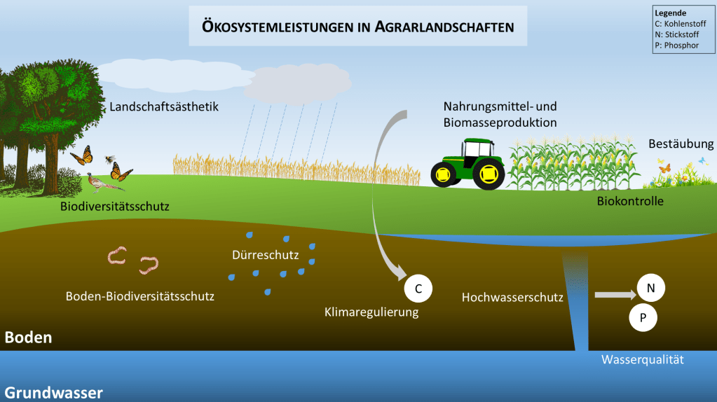 - Eine große Herausforderung bildet die Bezifferung der „wahren Preise“. Die landwirtschaftliche Produktion beeinflusst die Bereitstellung zahlreicher Ökosystemleistungen (s. Abbildung 2); diesen müsste jeweils ein monetärer Wert zugewiesen werden. Dies ist sehr schwierig und sehr kontextspezifisch, sodass verschiedene Studien zu teils stark abweichenden Ergebnissen kommen. Beispiele im deutschen Kontext sind unser Choice Experiment im Rahmen des BonaRes-Projekts (Bartkowski et al., 2022) oder die Studie von Scherzinger et al. (2024). Auch im Rahmen von AgriScape starten wird bald eine Choice-Experiment-Befragung, um einige der in Abbildung 2 dargestellten Ökosystemleistungen monetär zu bewerten. Alternativ könnte man sich, statt an Schätzungen des gesellschaftlichen Wertes dieser Ökosystemleistungen, an den Kosten ihrer Bereitstellung orientieren, was wiederum zu anderen Ergebnissen führen würde (und auch einer anderen Logik folgt). Welche Ökosystemleistungen man überhaupt berücksichtigt und welche Preise/Kosten man für diese zur Hand nimmt, hat große Konsequenzen dafür, zu welchen „wahren Preisen“ man gelangt und inwiefern sie mit anderen Preisen und Kosten vergleichbar sind (mit dieser Thematik schlägt sich das Umweltbundesamt übrigens seit Jahren im Kontext seiner Methodenkonvention zur Ermittlung von „Standardkostensätzen“ für Veränderungen in Ökosystemen herum).